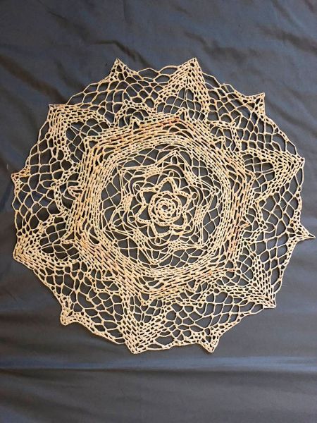 Все работы выполнены из листьев от початка кукурузы - талаша. Плетение безниточное, узоры авторские. Бусины серые это семена растения коикс или по народному бусенник, выращивать их стала с 2015 года. Панно и салфетка в форме снежинки выполнены в 2024 году, салфетка с коиксом и новогодние шары в 2021 году.