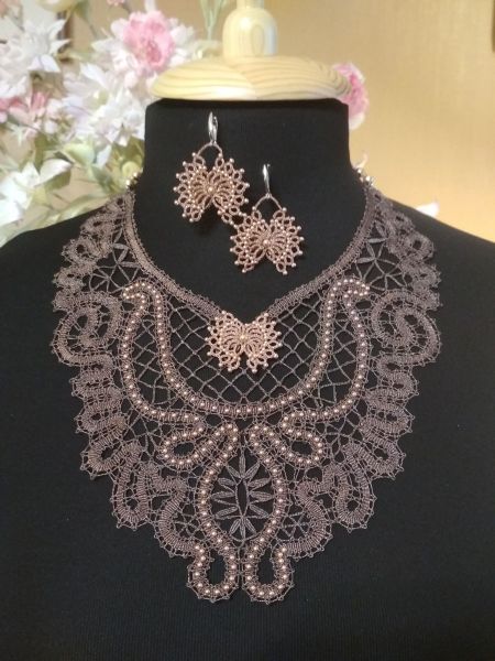 Представляю на конкурс коллекцию аксессуаров колье+серьги, выполненных в технике коклюшечного кружевоплетения "Пять волшебных вечеров". Работы выполнены из металлизированной нити Мадейра. Жемчуг добавлен во время плетения. Плела по сколкам И. Зубаревой и О. Судзиловской, но со своей интерпретацией и дизайном. Благодаря нитям и самому мелкому жемчугу Сваровски , колье и серьги выглядят ювелирными. Аксёнова Людмила Викторовна. Преподаватель в детской музыкальной школе (в данный момент пенсионерка). Занимаюсь созданием украшений и аксессуаров в технике коклюшечного кружевоплетения, фриволите, в технике шёлковой флористики, вышивки люневильским крючком и иглой.