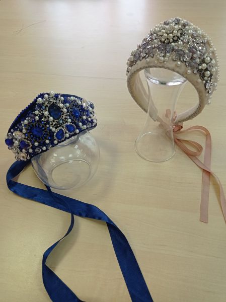 Бежевый Венец - выполнен 2022 г., Выполнен при помощи вышивки бисером, фетр, стразы, пайетки, бусины, бисер, атласная лента, тканевая резинка жемчуг стекло, основа картон. Стилизованная модель венца, за основу взяты были подвенечные венцы. Работу выполнила мастер Руденко Светлана Анатольевна. Бежевый кокошник- выполнен 2024 г., Выполнен при помощи наложения кружева и вышивки бисером, стразами,атласная лента, тканевая резинка, бархат, лен, основа пластиковая. Стилизованная модель кокошника, за основу были взяты кокошники выполненные в технике сажение по бели.Работу выполнила мастер Руденко Светлана Анатольевна. Комплект височные кольца 2- выполнен 2022 г. Выполнен при помощи проволоки. Проволока с памятью, бижутерная фурнитура, каменная крошка змеевик, бусины из полимерной глины. Стилизованная модель комплекта сережек и подвески, за основу взяты височные кольца и нагрудные обереги. Работу выполнила мастер Руденко Светлана Анатольевна. Комплект височные кольца - выполнен 2022 г. Выполнен при помощи проволоки. Проволока с памятью, бижутерная фурнитура, каменная крошка розового кварца и хрусталя, подвеска из розового кварца. Стилизованная модель комплекта сережек и подвески, за основу взяты височные кольца и нагрудные обереги. Работу выполнила мастер Руденко Светлана Анатольевна. Ленка (ожерелок)- выполнен 2023 г. Вышитая основа пуговицы, бисер, бусины, плетенные подвески с помпушками из ниток, на застежке из пуговки. Бисер, пуговицы, нити хлопок, шерсть, ткань лён. Шейное украшение выполнено по по старинным образцам. Работу выполнила мастер Руденко Светлана Анатольевна. Монисто - выполнено 2022 г. Выполнено техникой низание бисером. Использовалась нить шелковая, бисер, бижутерная фурнитура в виде монет, бусины акриловые.Шейное украшение выполнено по по старинным образцам. Работу выполнила мастер Руденко Светлана Анатольевна. На лобная диадема + нагрудный оберег - выполнено 2022 г. Выполнен при помощи вышивки бисером, фетр, бусины, цепь металлическая, полимерная глина, экокожа. Шейное и нагрудное украшение выполнено по фрагментам налобной диадемы из раскопок в могильниках 3-4 веков. На основе данного фрагмента и музейных материалов, был создан комплект украшений, состоящих из налобной диадемы с височными кольцами и нагрудного украшения. Работу выполнила мастер Руденко Светлана Анатольевна. Оплечье - выполнено 2023. Выполнено техникой низание бисером. Использовалась нить шелковая, бисер. Шейное украшение выполнено по по старинным образцам. Работу выполнила мастер Руденко Светлана Анатольевна. Синий венец выполнен 2022 г. Выполнен при помощи вышивки бисером, фетр, стразы, пайетки, бусины, бисер, атласная лента, тканевая резинка жемчуг стекло, основа картон. Стилизованная модель венца, за основу взяты были подвенечные венцы. Работу выполнила мастер Руденко Светлана Анатольевна. Гайтан - выполнен 2021г. Выполнено техникой низание бисером. Использовалась нить шелковая, бисер, бусины под жемчуг. Стилизованное шейное украшение, за основу взяты Гайтаны, Герданы которые были распространены у многих славянских народов России, их носили как мужчины, так и женщины . Работу выполнила мастер Руденко Светлана Анатольевна. С 2019 году в Мбук «Центр национальных культур» является руководителем студии ДПИ «Контрасты». Является автором научно-методической работ