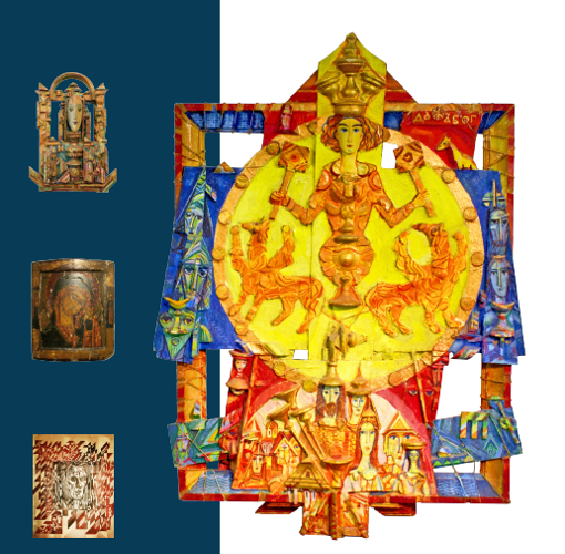 Смешанная техника; лепка из гипса с мозаикой, хрусталь, дерево, бархат.